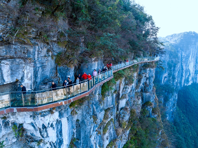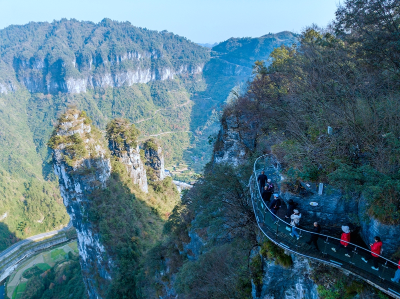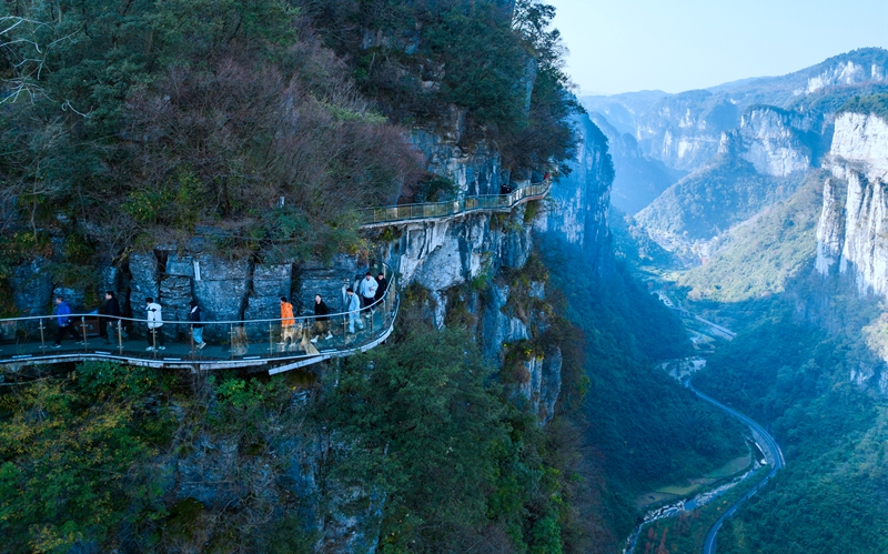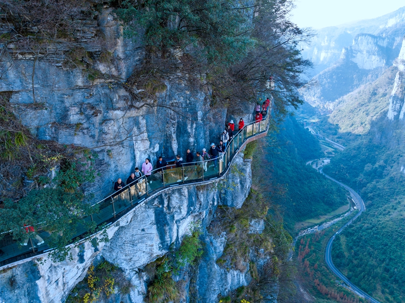 12月6日,吉首市矮寨奇观旅游区,游客在悬崖玻璃栈道观光游览。该景区凭借独特的万年峡谷风光、千年苗寨风情和百年路桥奇观,成为冬季旅游的热门目的地。彭璟 摄(湖南图片库)