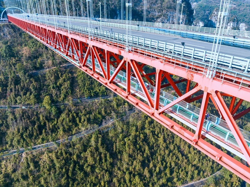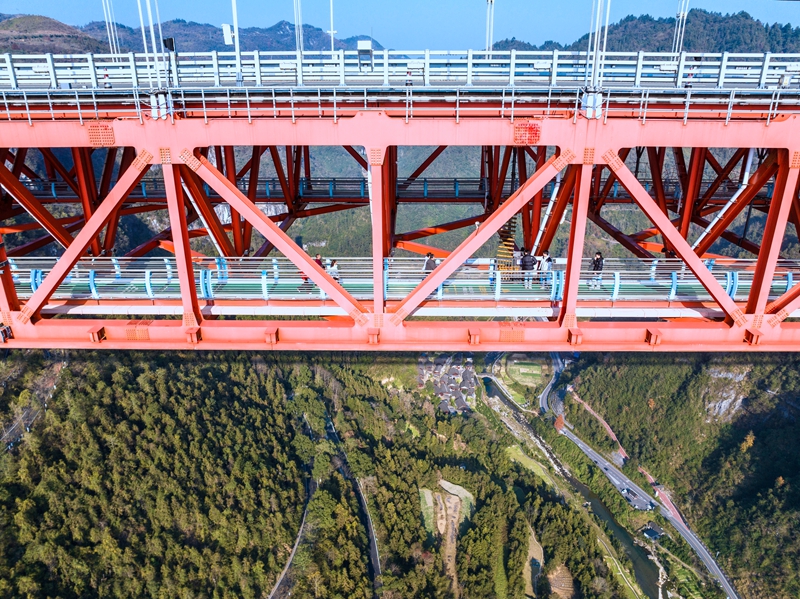 12月6日,吉首市矮寨奇观旅游区,游客在矮寨大桥观光游览。该景区凭借独特的万年峡谷风光、千年苗寨风情和百年路桥奇观,成为冬季旅游的热门目的地。彭璟 摄(湖南图片库)