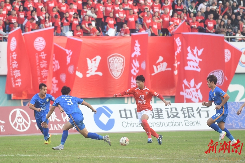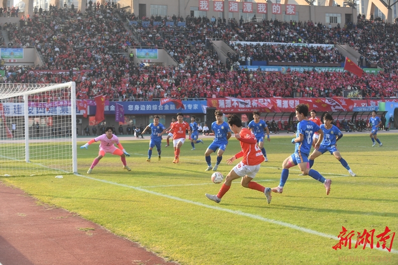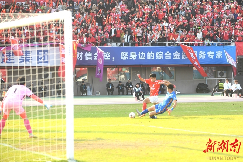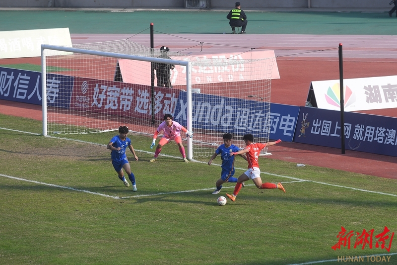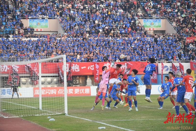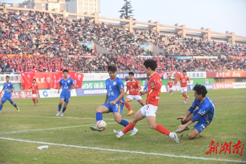 12月6日,双方球员在比赛中激烈拼抢。当天,2025湘超联赛第十三轮比赛,湘潭队主场对阵岳阳队,最终以0比1憾负对手。罗韬 摄(湖南图片库)