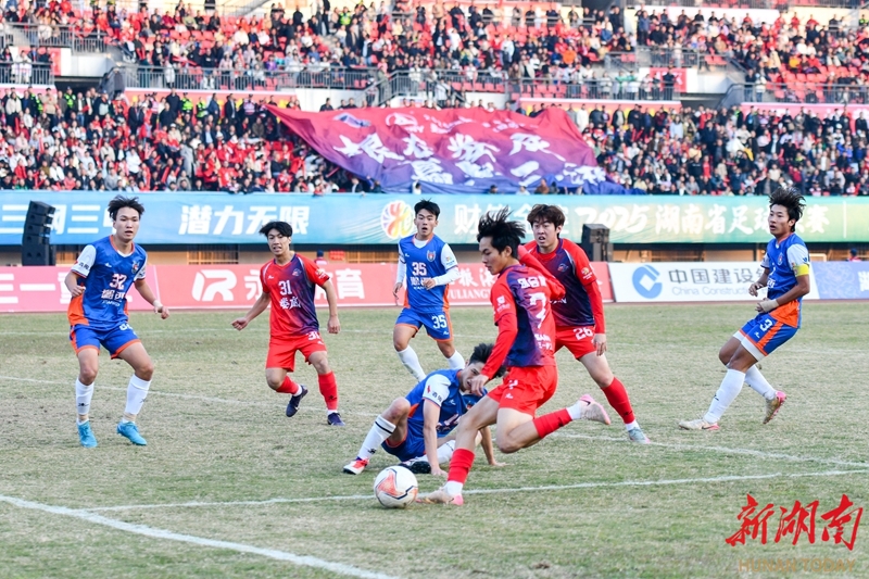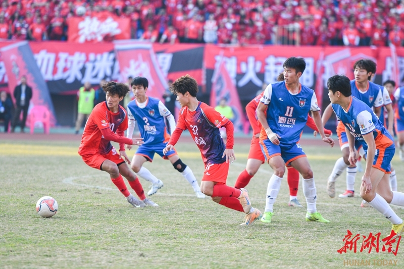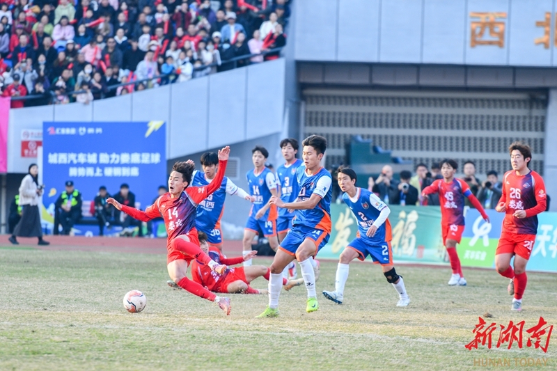 12月6日,双方球员在比赛中激烈拼抢。当天,2025湘超联赛第十三轮比赛,娄底队主场对阵湘西队,最终以3比0战胜对手。吴永华 摄(湖南图片库)