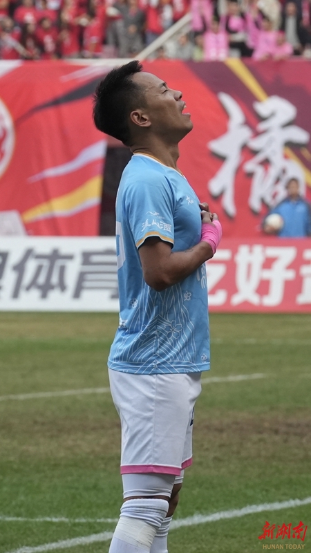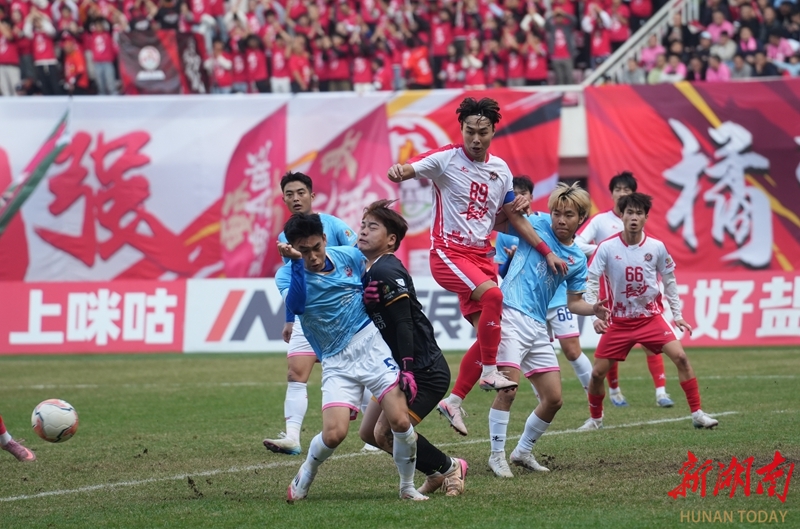 12月6日,双方球员在比赛中激烈拼抢。当天,2025湘超联赛第十三轮比赛,长沙队主场对阵常德队,最终以2比1战胜对手。邹麟 摄(湖南图片库)