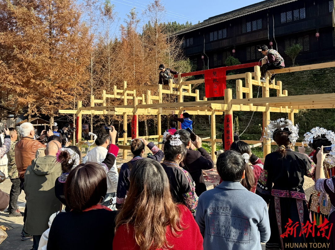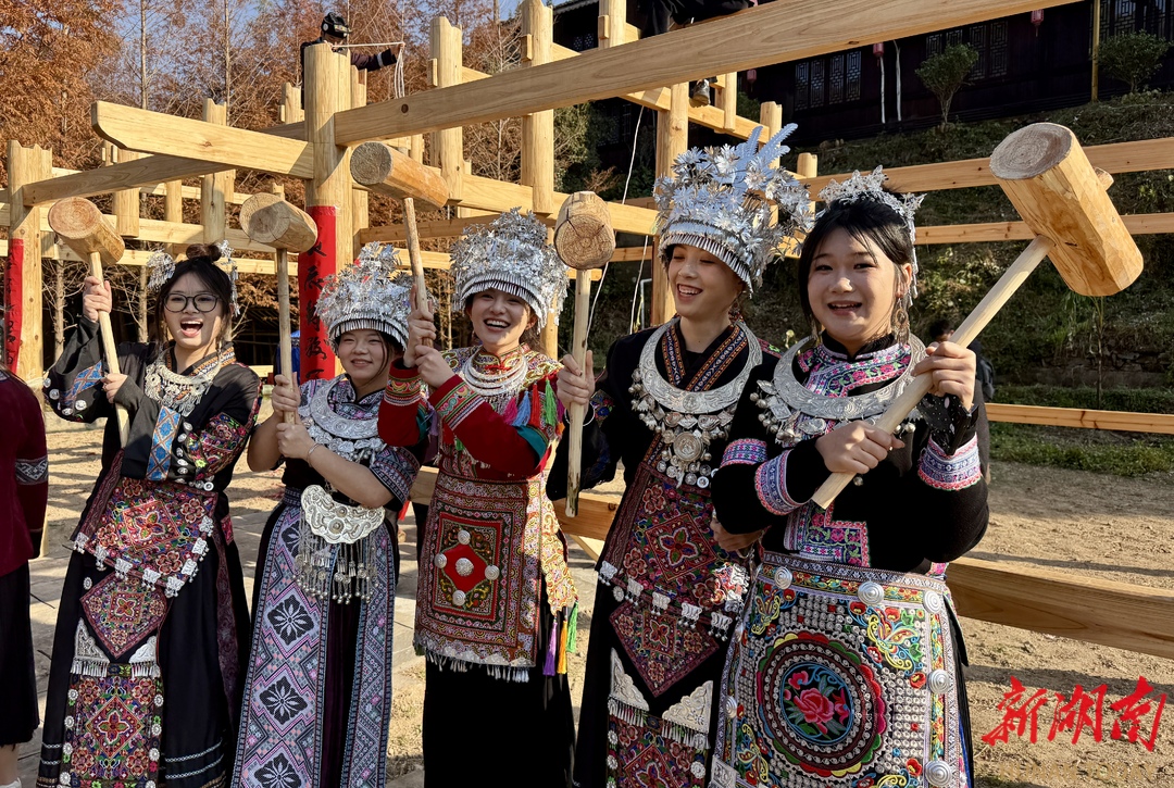 12月7日,通道侗族自治县坪坦新寨,游客在体验村民建房锤闩排柱的仪式感。近年来,该县依托侗民族传统文化资源,深挖民族文化瑰宝,以“活态传承”为核,以“沉浸体验”为媒,创新方式强化景区独特性,推出丰富多彩的文旅参与活动,让游客在游玩中深度解码侗民族文化。(陈志珍 陈俊宇 摄)