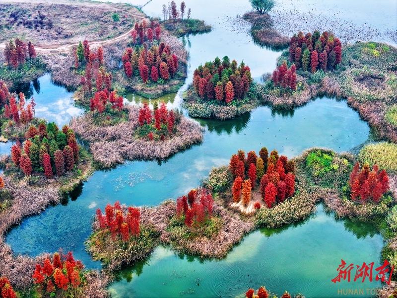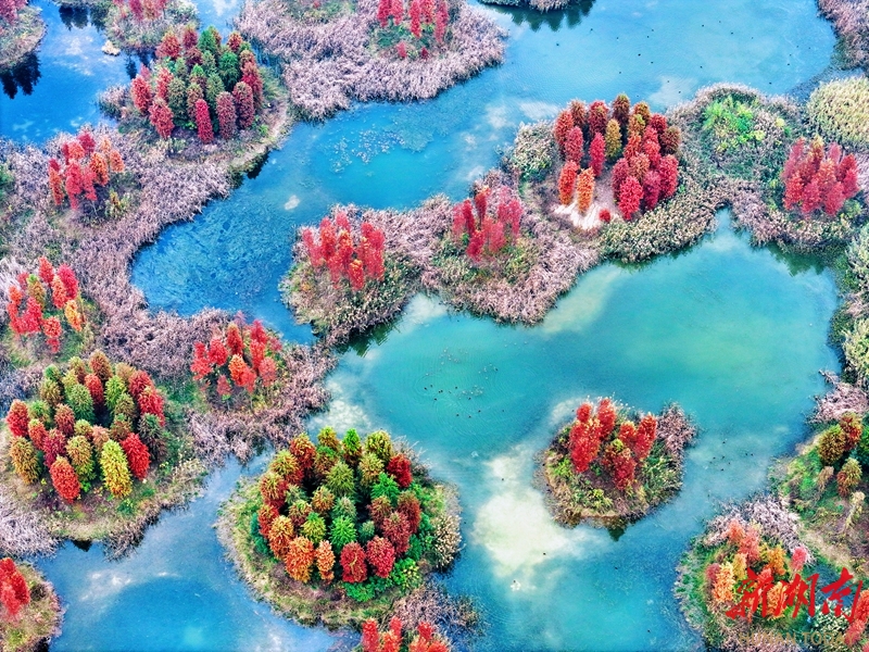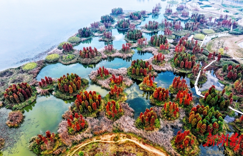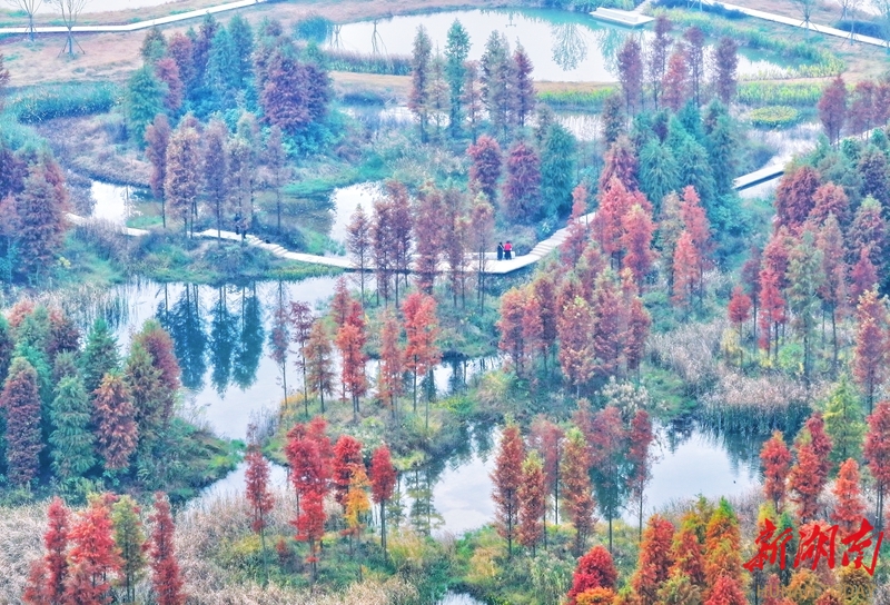 12月7日,大雪节气,长沙市大泽湖近自然湿地公园圆形树岛上的水杉树叶大多已变成红色,成为冬日里一道亮丽的风景线。这些水杉是公园生态景观的重要组成部分,水杉林与湿地景观融为一体,成为市民休闲观光的热门打卡地。湖南日报全媒体记者 徐行 摄