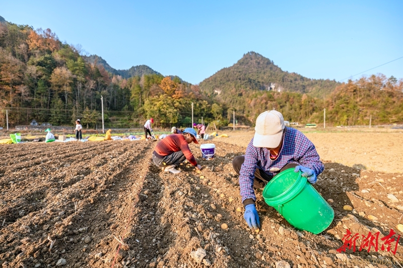 12月7日,吉首市乾州街道西门口村,农民在田间栽种马铃薯。当天是大雪节气,各地农民抢抓农时,有序开展冬季农业生产。彭彪 摄(湖南图片库)