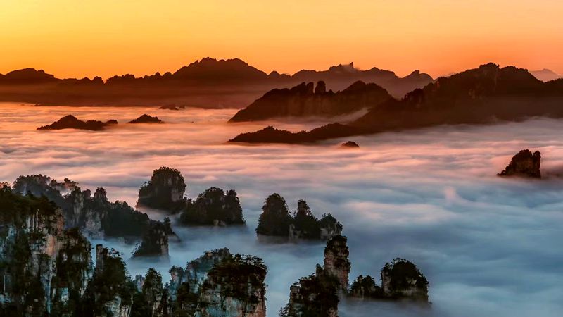 作为世界自然遗产,张家界国家森林公园拥有全球罕见的砂岩峰林地貌,三千奇峰拔地而起,峰体在漫长地质演化中呈现出红褐与青灰交织的独特肌理;八百秀水蜿蜒其间,负氧离子充沛的原始森林与变幻莫测的云海交相辉映,共同勾勒出“现实版潘多拉”的独特魅力。