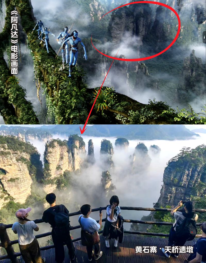 此次《阿凡达3:火与烬》延续创作脉络并深化自然灵感,网友对比发现,片中潘多拉星球“火焰部族”居住的赤色峰林、云雾中若隐若现的平行峰墙,与张家界天子山、黄石寨、索溪峪等地的自然奇观形成奇妙呼应。