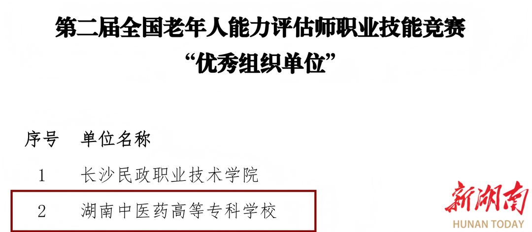 湖南日报·新湖南客户端12月8日讯(通讯员 程亮 王松韬)12月4日至7日,第二届全国老年人能力评估师职业技能竞赛在长沙举办。本次竞赛吸引全国26个省(自治区、直辖市)的310名选手同台竞技,经过激烈角逐,来自湖南中医药高等专科学校的曾宪梅老师、曾影同学斩获铜奖,程亮老师、张添乐同学、吴姣同学、周彤同学荣获优秀奖,学校获评全国老年人能力评估师职业技能竞赛“优秀组织单位”。