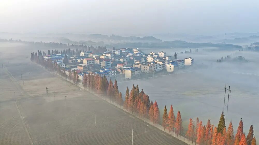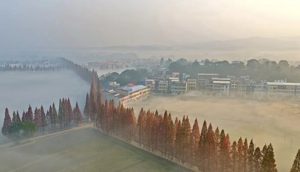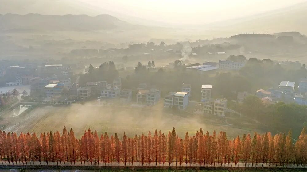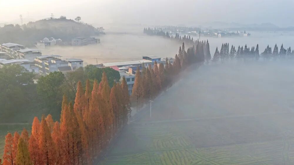 他拍雾气的流动,拍光落在屋檐的片刻,也拍雾中醒着的生活痕迹:或许是村民推门的背影,或许是村道两旁种植的水杉,在朦胧中透出一点颜色。