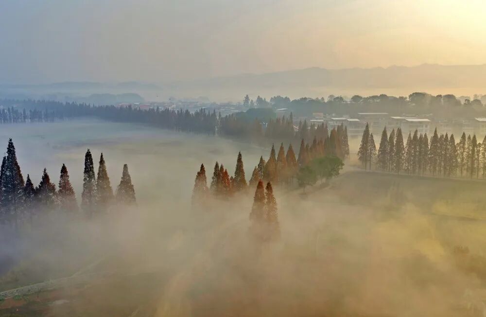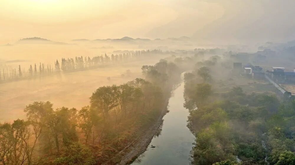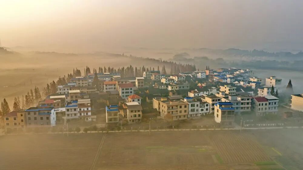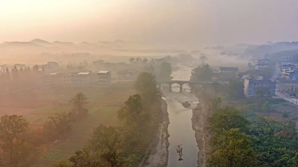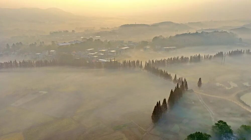 村子很静,偶有鸟鸣。阳光穿过云雾,落在草叶的露珠上,也照亮雾中的风景。这样的天气,刚好。