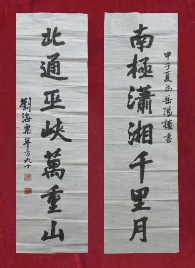 此时,洞庭波光、潇湘风月,仿佛一齐涌上心头、倾注笔端。刘海粟手握巨笔,凝神远眺,然后引笔挥洒、力透纸背。少时,一副笔墨酣畅、雄浑遒劲的楹联一气呵成。然后,他在上联右方题序:“甲子夏为岳阳楼书”,在下联左方题款:“刘海粟年方九十”。