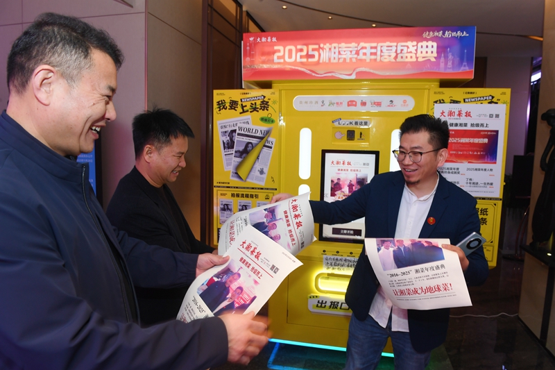 12月8日,以“健康湘菜·拾级而上”为主题的2025湘菜年度盛典在长沙启幕。本届盛典延续“剖析行业趋势、表彰业界典范、共享荣耀时刻”的宗旨,带来更加丰富多元的活动,覆盖产业研讨、品牌推介、荣誉表彰、厨艺竞技等多个方面,与全球湘菜人共享欢乐与荣耀。图为观众在体验《大湘菜报》推出的“我要上头条”互动打卡装置。湖南日报全媒体记者 徐行 戴厚存 摄影报道