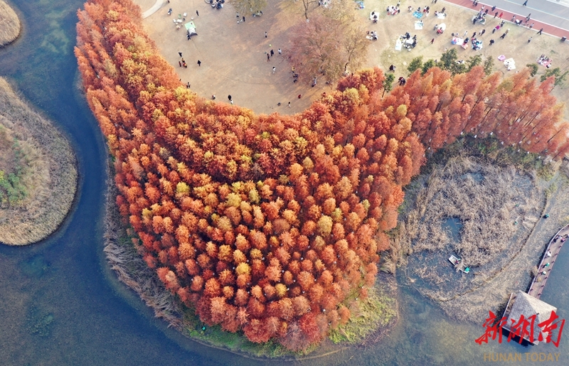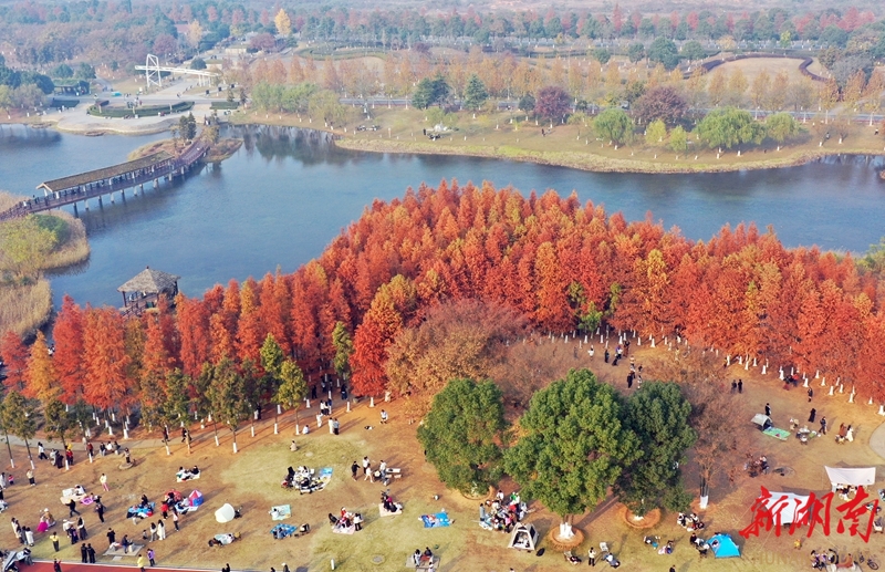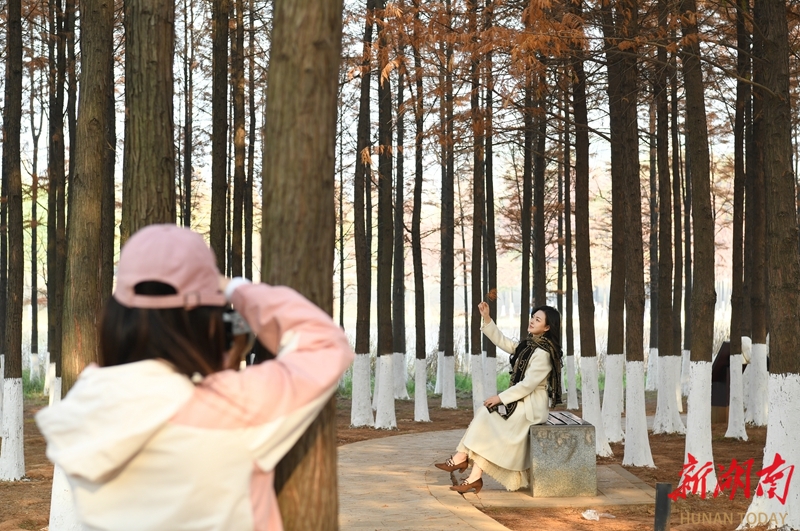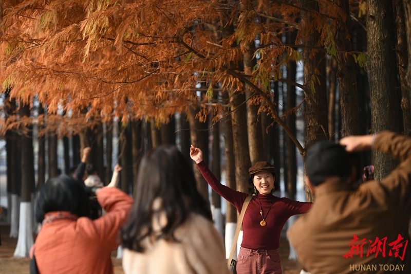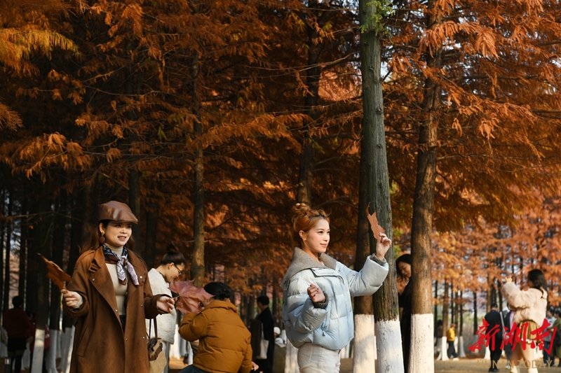 12月8日,湖南松雅湖国家湿地公园,游客在水杉林游玩。进入冬季,园内水杉林迎来最佳观赏期,吸引了众多游客和摄影爱好者前来赏景拍照。湖南日报全媒体记者田超 摄