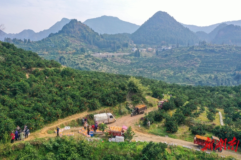 12月7日,龙山县里耶镇比耳村,果农在转运里耶脐橙。趁着连日晴好天气,当地果农加紧对里耶脐橙进行采摘、分级、包装,确保新鲜优质的果实及时供应市场。曾祥辉 摄(湖南图片库)