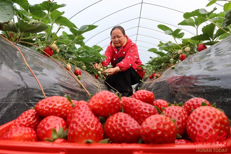 12月8日,城步苗族自治县儒林镇杨家将村,村民在采收草莓。近年来,该县充分发挥高山生态优势,通过引进优质水果、扶持大棚种植、加强服务指导等措施,大力发展特色水果产业,带动村民增收致富。 严钦龙 摄(湖南图片库)