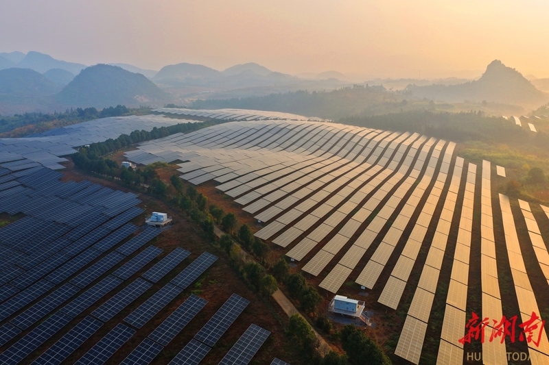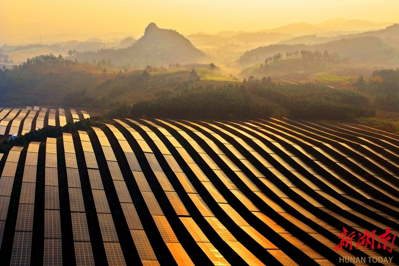12月8日,蓝山县楠市镇农光互补光伏发电站,光伏板在晨光的映照下熠熠生辉。近年来,该县践行生态优先、绿色发展理念,充分利用闲置荒地、山坡建设光伏电站,推动光伏产业与农副产业相互融合,促进企业增效、农民增收。黄春涛 摄(湖南图片库)