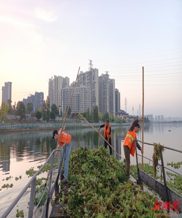 (图为河道保洁部组织人员打捞滨江公园沿河河面水草等垃圾)