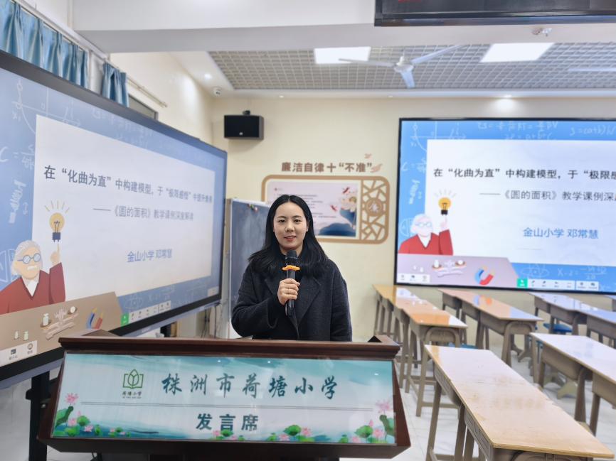 中高年级的展示同样精彩纷呈。周杨老师执教《圆的面积》,以“哪吒与飞天猪”的情境引入,遵循“变已知—找关系—推结论”的教学逻辑,通过小组剪拼、几何画板动态演示,直观呈现“化曲为直”的转化思想与极限思维,助力学生发现圆与近似长方形的内在关联,成功推导出圆的面积计算公式。课程同步搭配星级分层练习与教学评一体化设计,在趣味探究中培育学生的推理能力与空间观念。邓常慧老师在解读中强调:新课标对数学核心素养的要求与课题思维一体化高度契合。本节课立足思维一体化理念,以结构化活动为载体、转化思想为核心,结合学情突破教学难点,实现知识传授与核心素养培育的协同发展。