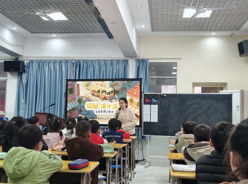 活动的主体部分聚焦于生动的课例展示,通过真实课堂案例,深入诠释了数学思维一体化的内涵。李梦兰老师执教《探秘“凑十法”》,成为低年级数学思维培养的典范。她巧妙运用AI创设“逛美食街”的情境,引导学生理解“凑十”的算理逻辑,并设计分层练习,确保不同学习能力的学生都能在理解基础上深化应用。这一创新不仅提升了课堂互动性,更体现了“思维一体化”的核心:从具象操作过渡到抽象推理。随后,杜丽老师对该课例进行了解读,她分析道,单元结构化整合是数学思维培养的整体性保障,通过将“凑十法”融入更大单元框架,学生能逐步建立知识间的联系,避免碎片化学习,从而在小学阶段形成连贯的数学思维链条。