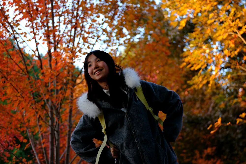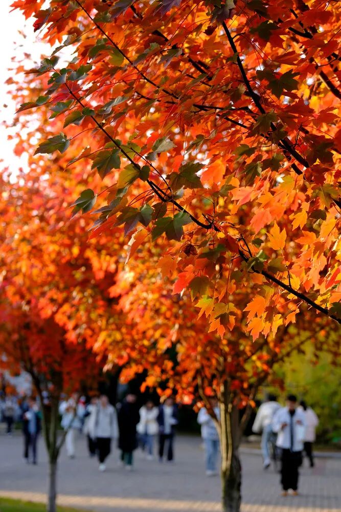 绯红枫林环绕教学楼,学子捧书穿行其间,知识殿堂披上最浪漫秋装。(摄|林道辉)