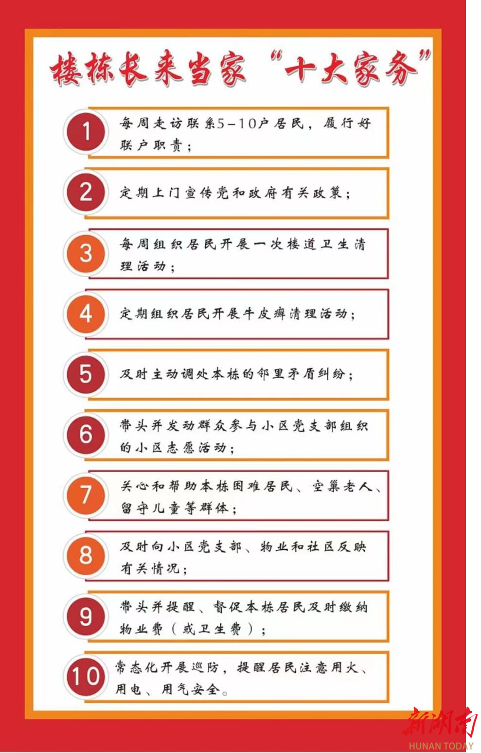 近年来,茨菇塘街道以党建引领,探索推出“楼栋长来当家”工作机制,一张涵盖走访联络、政策宣讲、矛盾调解、安全巡防等十个方面的“十大家务”清单,让楼栋长们干事有方向、服务有抓手,真正把治理的根系扎进了每栋楼、每户人。