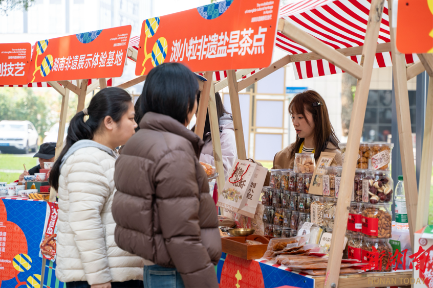 “甜酒,小钵子甜酒!”“有各种口味的酸枣、糕点、熟食,尝尝”……郭福娭毑小钵子甜酒、浏小粒非遗盐旱茶点、湘益茯茶等“舌尖上的非遗”大受欢迎,吸引不少人品尝购买;九芝堂传统中药文化、龙氏驱寒中医中药技艺等康养为干部群众问诊、施针、理疗,大家在展位前谈论着中医养生之道;湘西十八洞苗绣、滩头高腊梅年画、醴陵釉下五彩瓷烧制技艺、镜岛手作掐丝造花等作品琳琅满目、独具匠心;湘绣“绣娘”现场飞针走线,杖头木偶戏演绎着湖湘民俗故事……