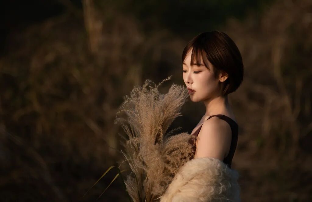 一头红棕色短发被霞光镀上了金边,微微侧首,精致的妆容在柔光下显得格外清透,眼眸望向镜头,带着一丝若有似无的笑意。