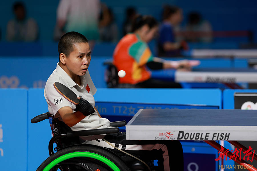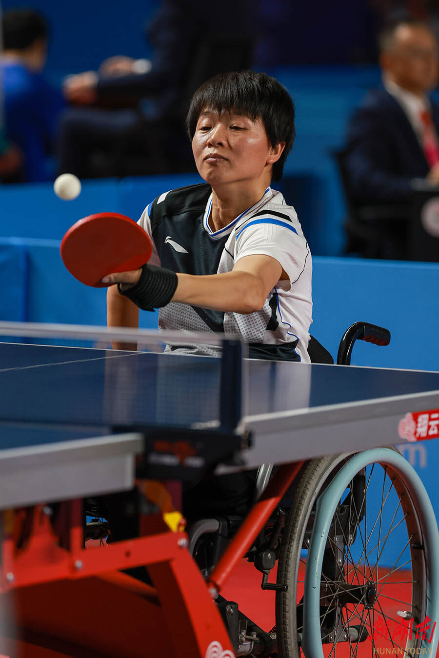 12月11日,全国第十二届残疾人运动会暨第九届特殊奥林匹克运动会乒乓球项目比赛在广州体育职业技术学院体育馆进行。湖南队李霞正在进行TT2女子单打小组赛比赛。 湖南日报全媒体记者 傅聪 摄
