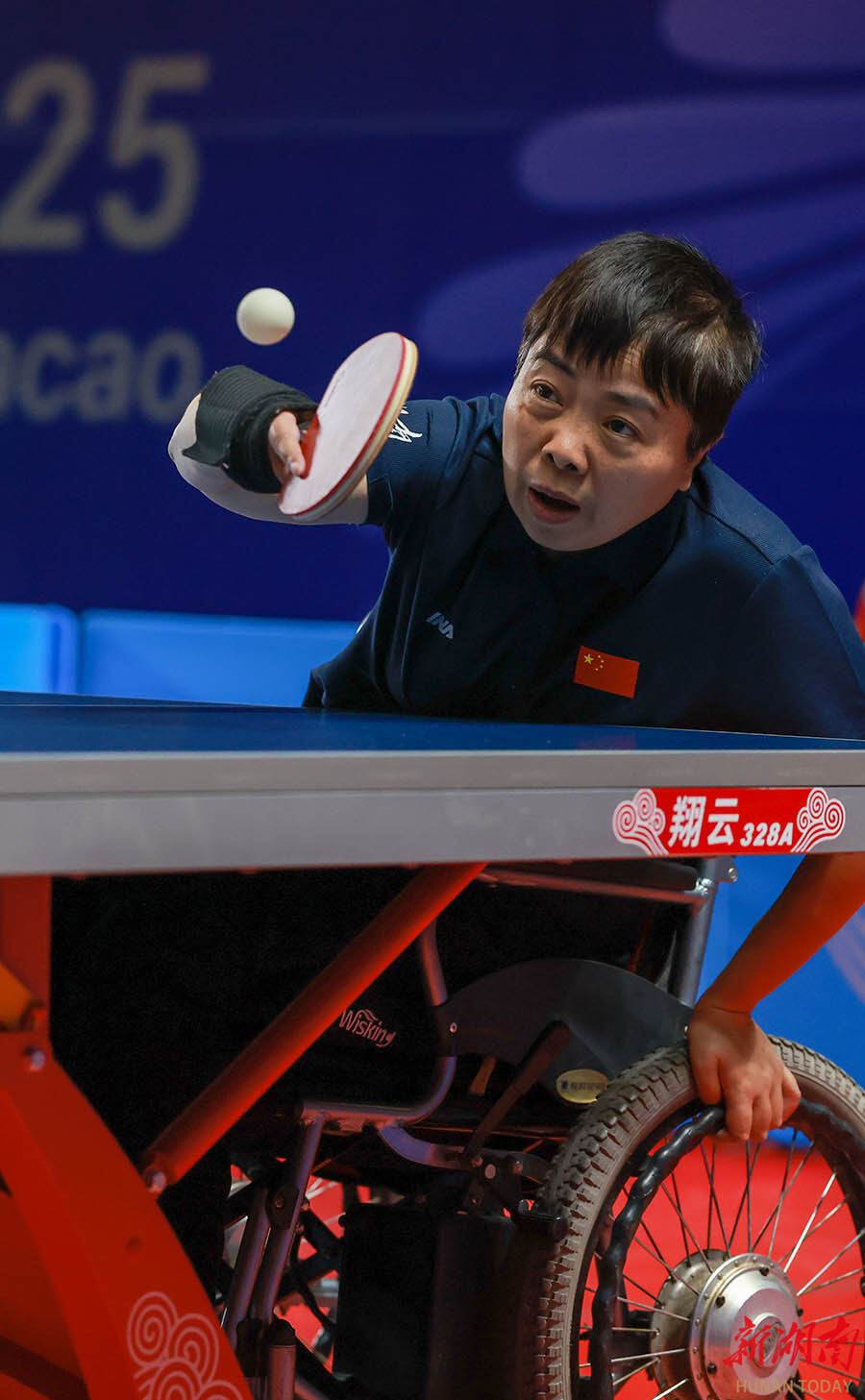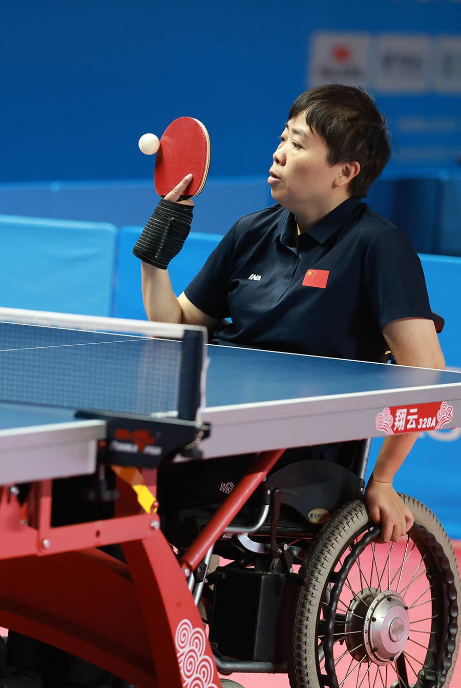 12月11日,全国第十二届残疾人运动会暨第九届特殊奥林匹克运动会乒乓球项目比赛在广州体育职业技术学院体育馆进行。湖南队阎海英正在进行TT2女子单打小组赛比赛。 湖南日报全媒体记者 傅聪 摄