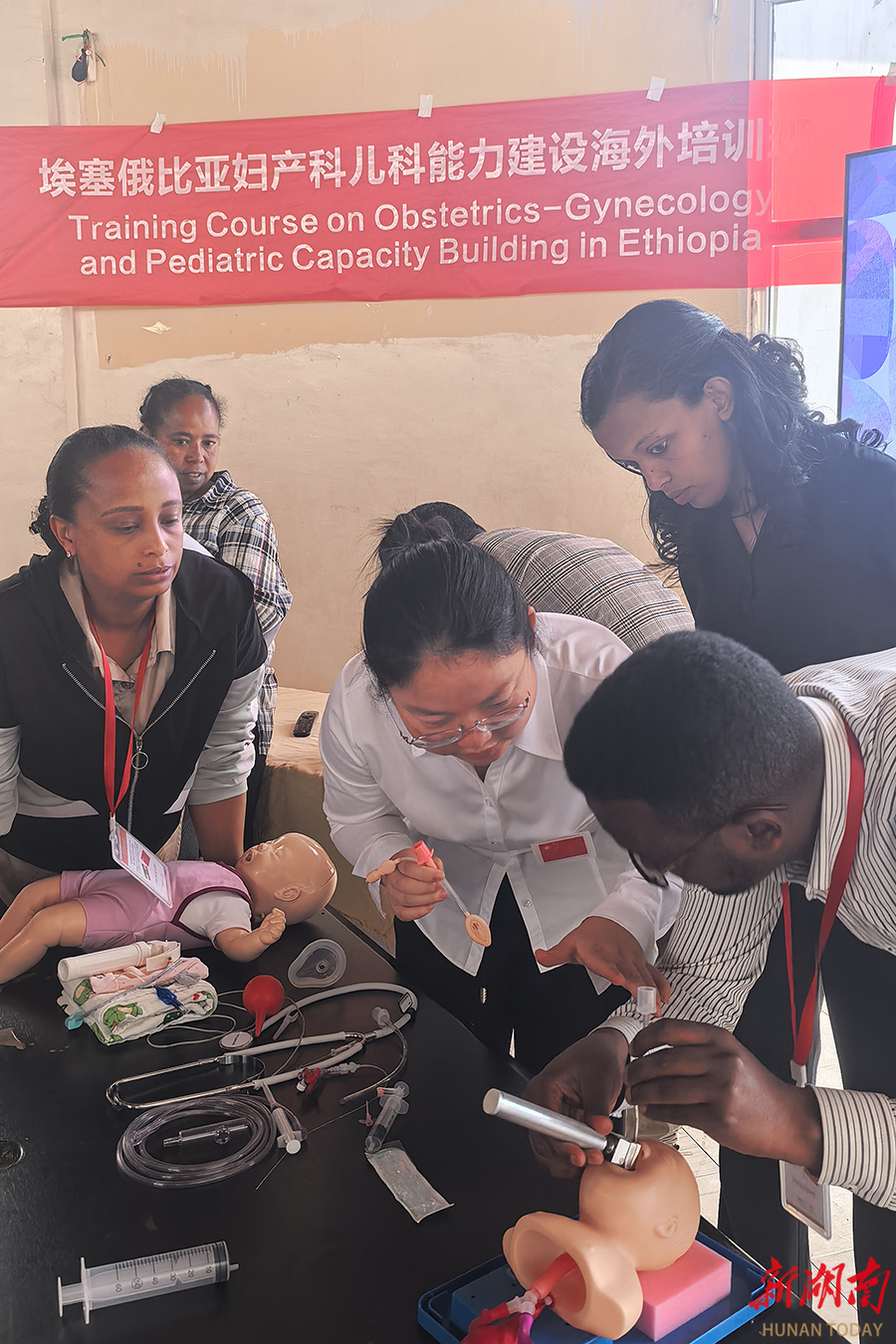 12月8日,埃塞俄比亚,专家团成员为当地医生提供业务指导。近日,由中华人民共和国商务部主办、湖南省儿童医院承办的“埃塞俄比亚妇产科儿科能力建设海外培训班”举办。培训班采用“理论授课+技能实操+案例研讨+临床带教”相结合的模式,促进中埃在妇幼健康领域的可持续发展合作,推动中非卫生合作迈向更可持续、更高水平的发展。丁向 摄(湖南图片库)
