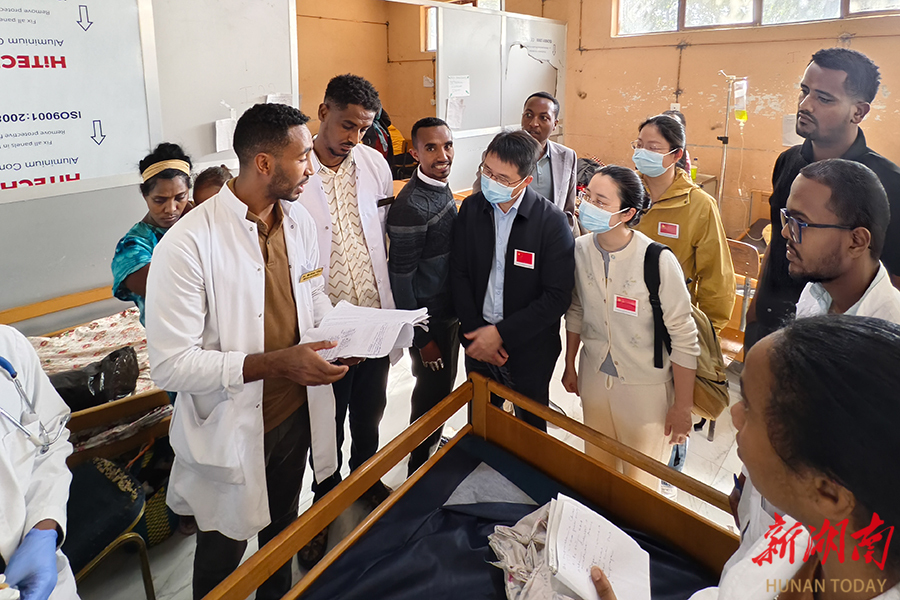 12月8日,埃塞俄比亚,专家团与当地医生交流。近日,由中华人民共和国商务部主办、湖南省儿童医院承办的“埃塞俄比亚妇产科儿科能力建设海外培训班”举办。培训班采用“理论授课+技能实操+案例研讨+临床带教”相结合的模式,促进中埃在妇幼健康领域的可持续发展合作,推动中非卫生合作迈向更可持续、更高水平的发展。丁向 摄(湖南图片库)