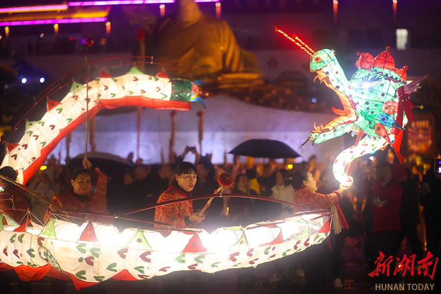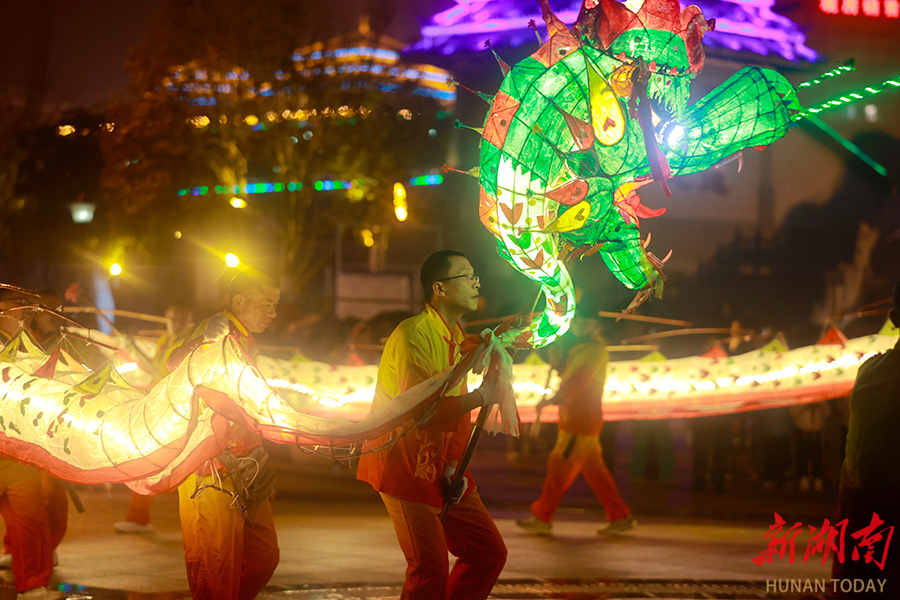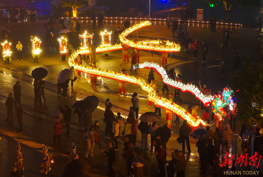 12月12日晚,通道侗族自治县萨岁广场上演精彩舞龙表演,流光溢彩的龙影吸引众多市民游客观赏。近年来,该县通过打造集观演、美食、非遗体验于一体的夜间消费场景,促进文旅融合发展。 李尚引 摄(湖南图片库)