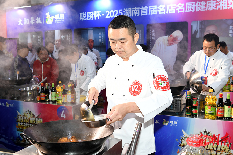 12月12日,“聪厨杯”2025湖南省首届名店名厨健康湘菜厨艺大赛开赛。本次活动是2025湖南文化旅游产业博览会暨首届“12.12”文旅消费购物节湘菜美食文化展区的重要配套活动。全省百位名厨围绕“减油、减盐、减糖”健康标准同台竞技,创新湘菜风味。赛事特设“人机大战”对决环节,展现传统技艺与智能科技的精彩碰撞。 湖南日报全媒体记者 田超 摄