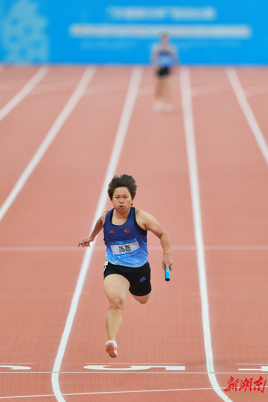 12月12日,在全国第十二届残疾人运动会暨第九届特殊奥林匹克运动会的女子4x100米T35–T38级比赛中,湖南代表队运动员史逸婷、文晓燕、蒋芬芬、周霞以49.11的成绩获得金牌。图为周霞在冲过终点。 湖南日报全媒体记者 傅聪 李毅 马如兰 摄影报道