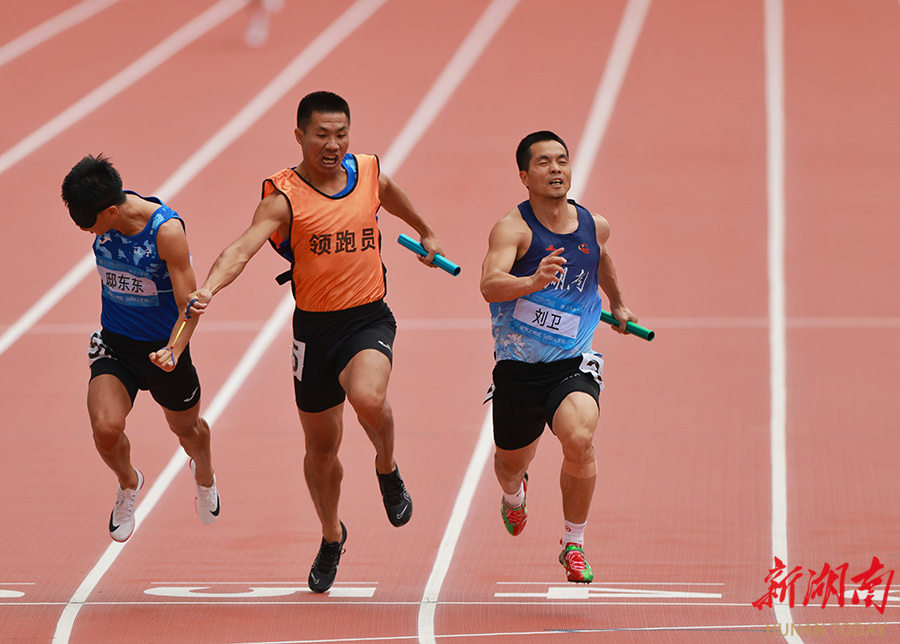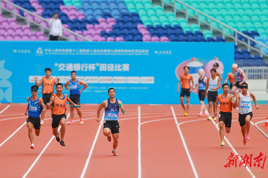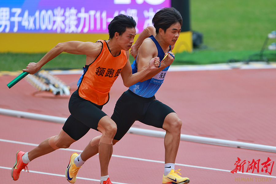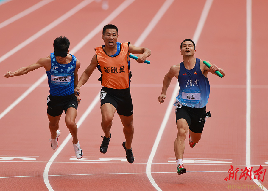 12月12日,在全国第十二届残疾人运动会暨第九届特殊奥林匹克运动会的男子4x100接力T11–T13级决赛中,湖南代表队运动员朱乾、陈世昌、孔健焜、刘卫以44.05(.045)的成绩获得金牌,亚军成绩为44.05(.046)。图为朱乾(右)在比赛中。 湖南日报全媒体记者 傅聪 李毅 马如兰 摄影报道