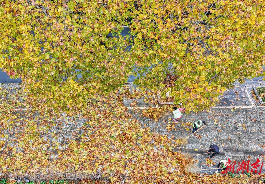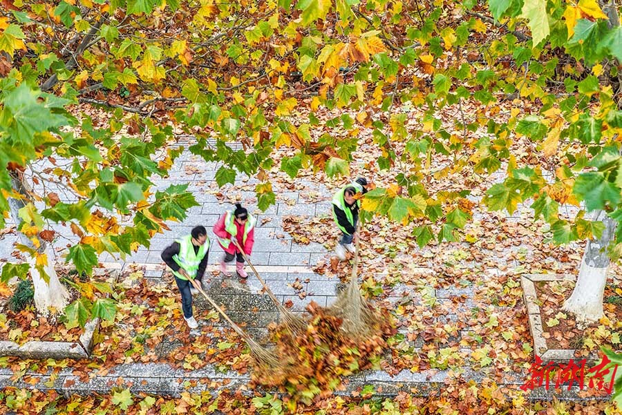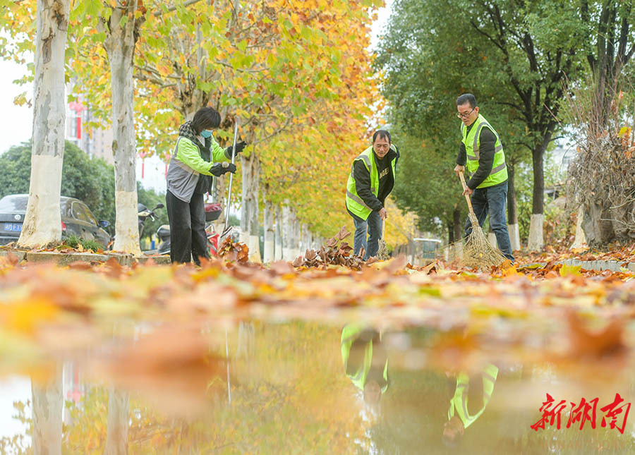 12月13日,道县湘源大道,环卫工人在清扫落叶。近年来,该县通过实施生态绿化提升工程,在道路两侧种植梧桐、银杏等彩叶树种,打造四季景观,提升市民生活品质。 蒋克青 摄(湖南图片库)