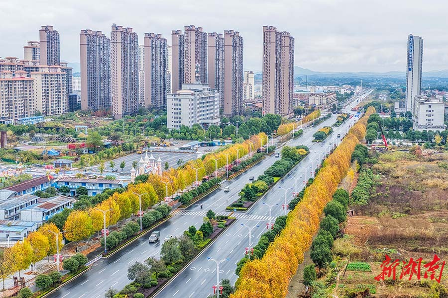 12月13日,道县湘源大道的梧桐树叶金黄,层林尽染,成为冬日城市亮丽风景线。近年来,该县通过实施生态绿化提升工程,在道路两侧种植梧桐、银杏等彩叶树种,打造四季景观,提升市民生活品质。 蒋克青 摄(湖南图片库)