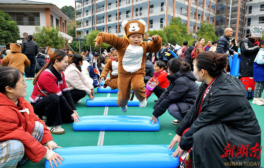 12月13日,吉首市第十三幼儿园,家长和孩子们在参与《蹦蹦跳跳》游戏。当天,该园举办“聚民族团结情·传民族非遗韵”亲子运动会,孩子们通过趣味游戏感受传统文化,在欢乐互动中增进亲子情感,促进健康成长。 姚方 刘丹 摄影报道(湖南图片库)