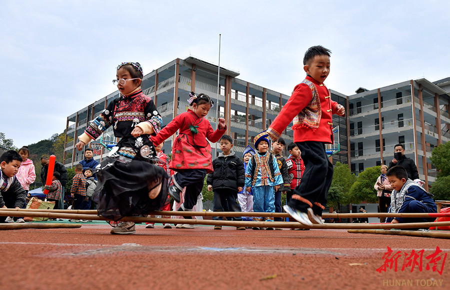 12月13日,吉首市第十三幼儿园,孩子们在表演跳竹竿舞。当天,该园举办“聚民族团结情·传民族非遗韵”亲子运动会,孩子们通过趣味游戏感受传统文化,在欢乐互动中增进亲子情感,促进健康成长。 姚方 刘丹 摄影报道(湖南图片库)