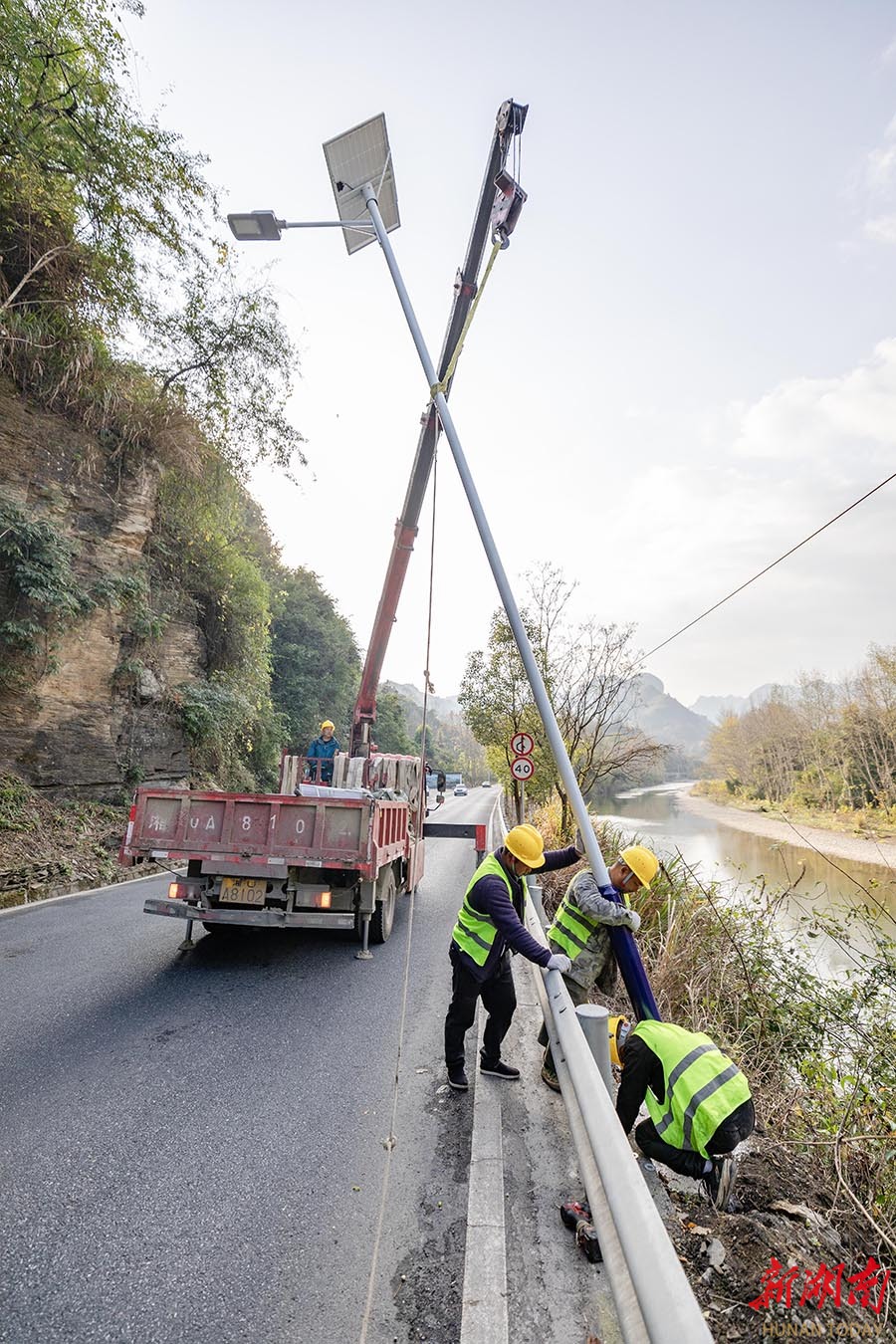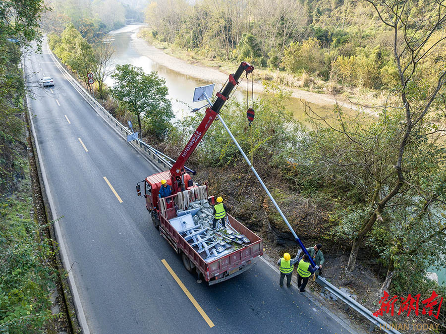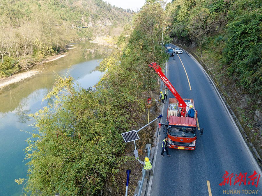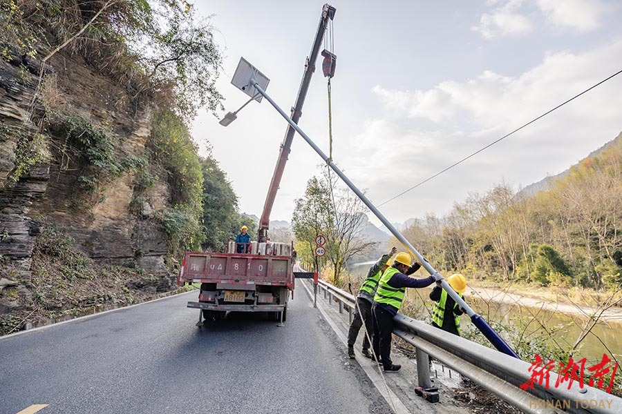12月13日,吉首市矮寨镇坪朗村,工人在G209国道安装太阳能路灯。近期,该市公路部门利用晴好天气,组织工人在G209国道石家冲街道至矮寨镇旅游路段进行路灯安装、护栏养护及边沟疏通等施工,全面提升道路夜间通行条件,助力旅游发展和民生改善。 彭璟 摄(湖南图片库)