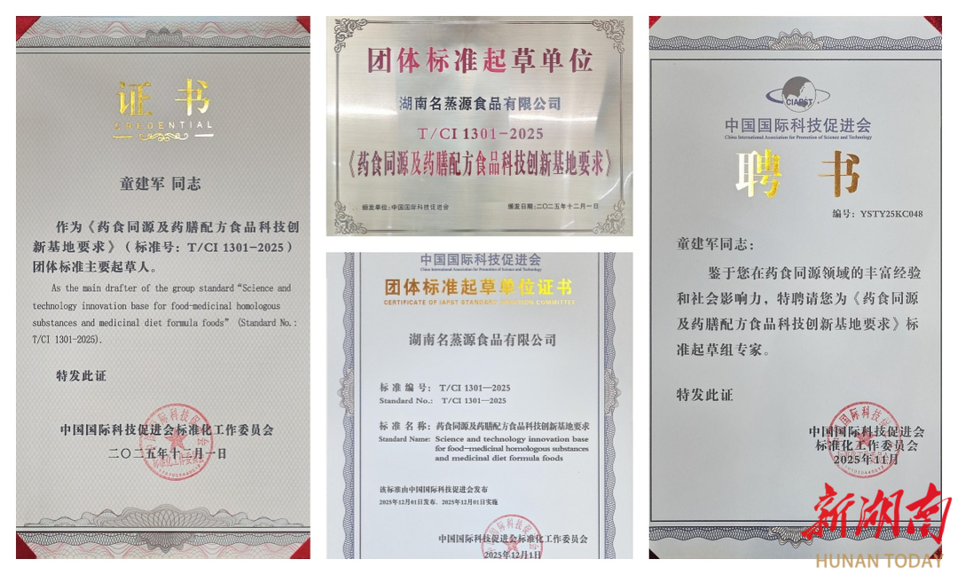近日,湖南名蒸源食品有限公司凭借在健康餐饮赛道的深耕厚植,以及在药食同源领域的前瞻布局与技术深耕,成功跻身中国国际科技促进会《药食同源及药膳配方食品科技创新基地要求》(标准号:T/CI 1301-2025)团体标准起草单位之列。与此同时,公司董事长童建军携药食同源领域的深厚实践积淀与广泛行业声望,荣聘为药食同源标准起草组专家,并被推选为标准主要起草人,这不仅是企业创新实力的国家级认证,更彰显了在国家强化标准引领战略下,民营企业参与产业标准化建设的责任与担当。