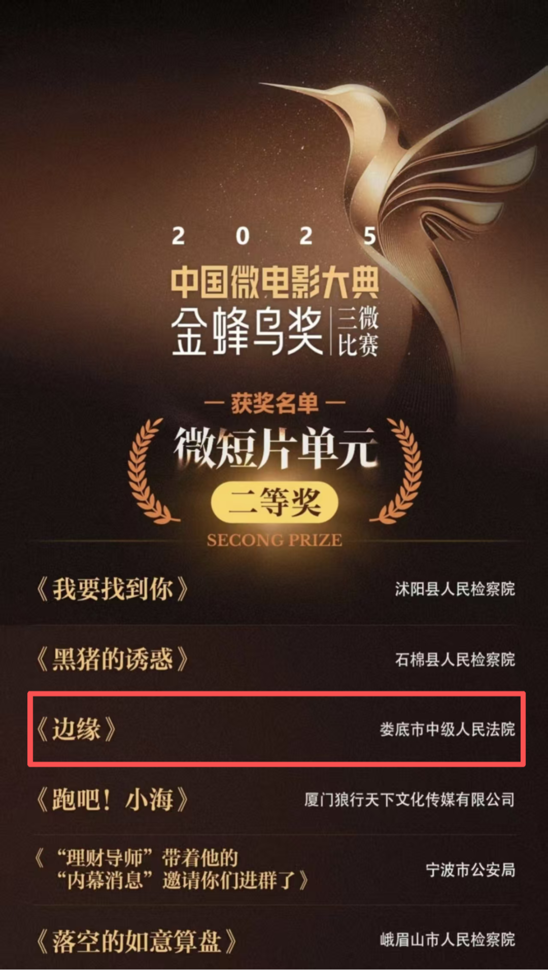 近日,由中宣部、国家广电总局等16个部级单位联合指导,中国微电影大典组委会主办,“金蜂鸟奖”三微比赛组委会、浙江法治报社、中共诸暨市委政法委承办,中广联合会法治传媒委员会、中国微电影大典青少年影视培训中心协办的2025·中国微电影大典“金蜂鸟奖”三微比赛获奖名单公布。其中,娄底法院出品的《边缘》《星火》《妄言》《无所遁形》4部作品获微短片单元奖相关奖项。