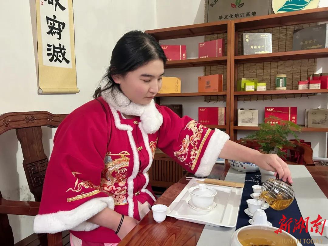 衡科茶艺青春工坊内,衡阳科技职业学院护理专业学生李嘉璐身着茶艺服饰,娴熟地为市民冲泡衡有茶。“学校茶艺社为我们提供了成长平台。”李嘉璐介绍,由40余名社员组成的茶艺社,联合茶文化研究院打造了这一创业工坊。其指导老师张红艳表示,衡阳茶资源丰富,团队正推进衡茶加工工艺升级,后续计划开发茶旅融合线路,进一步拓宽学生实践的渠道。