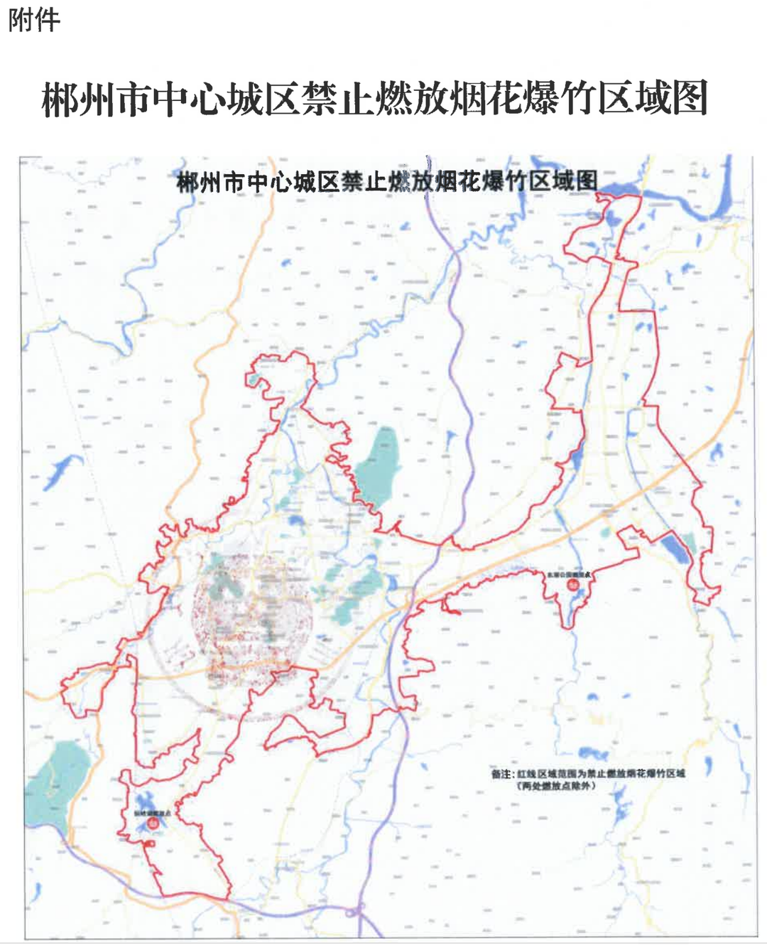 一、郴州市中心城区禁止燃放烟花爆竹的区域(以下简称“禁燃区”)具体为:柿竹园社区—麻田村—苏仙区农垦场—飞天山国家地质公园—郴永大道(雅市村段)—千里湖山—青年大道人民路交汇处—卜里坪村—龙女温泉景区—同心桥村—华泰城—雷大桥村—石盖塘村—田家湾村—郴州大道(王仙岭风景区段)—长卷文化旅游度假区—白露塘村—柿竹园社区所形成的对应闭合区域(详见附件)。