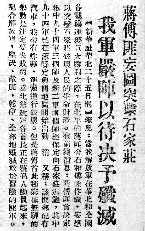 △1948年10月26日,《人民日报》1版刊登新华社电讯稿《蒋傅匪妄图突击石家庄我军严阵以待决予歼灭》。