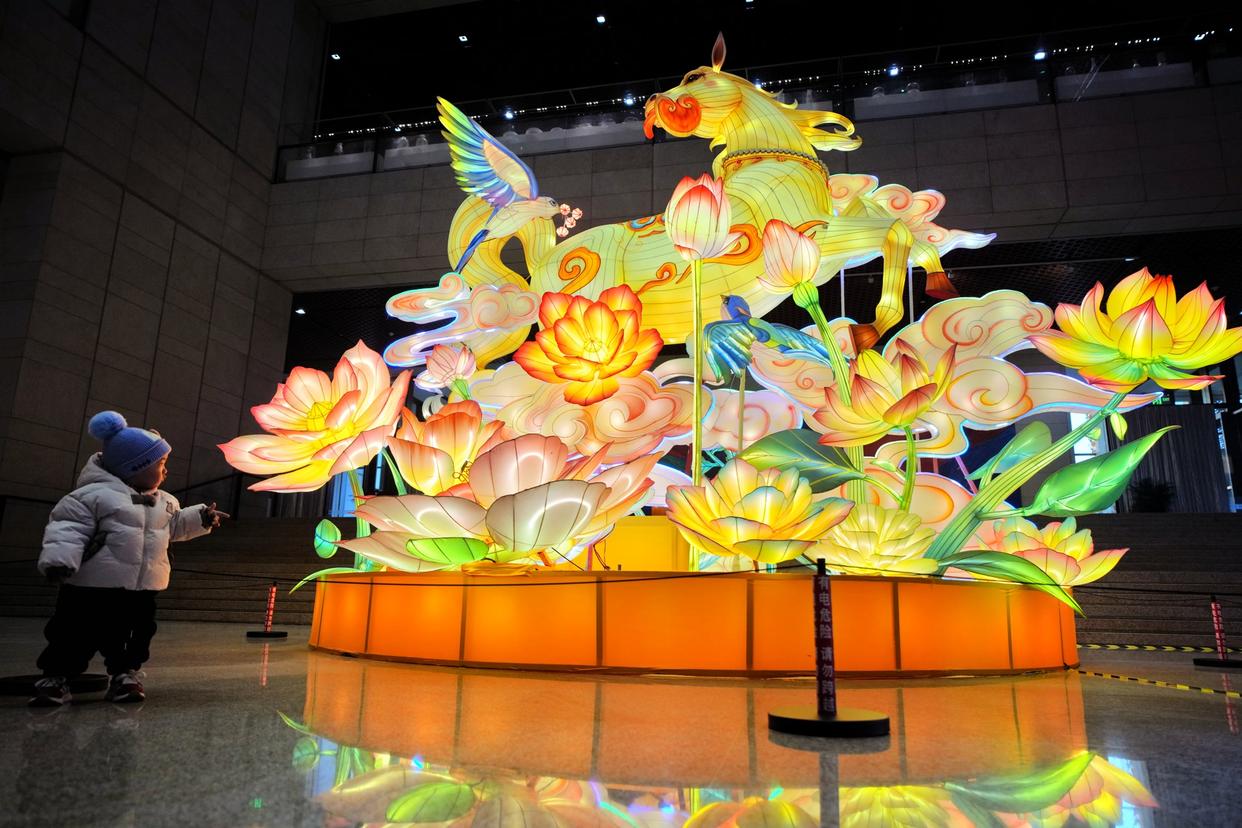 走进大厅,一组“天马献瑞”彩灯赫然映入眼帘,工作人员介绍,这组彩灯的设计灵感源自中国经典文物形象“马踏飞燕”的造型。灯组中的天马姿态矫健,奔腾于祥云之上,它昂首衔芝,周身环绕着飞燕与繁花,既以奔腾的飒爽之姿洋溢出新春特有的蓬勃朝气,又象征着中国人奋进、向前、自强、勇敢的进取精神。