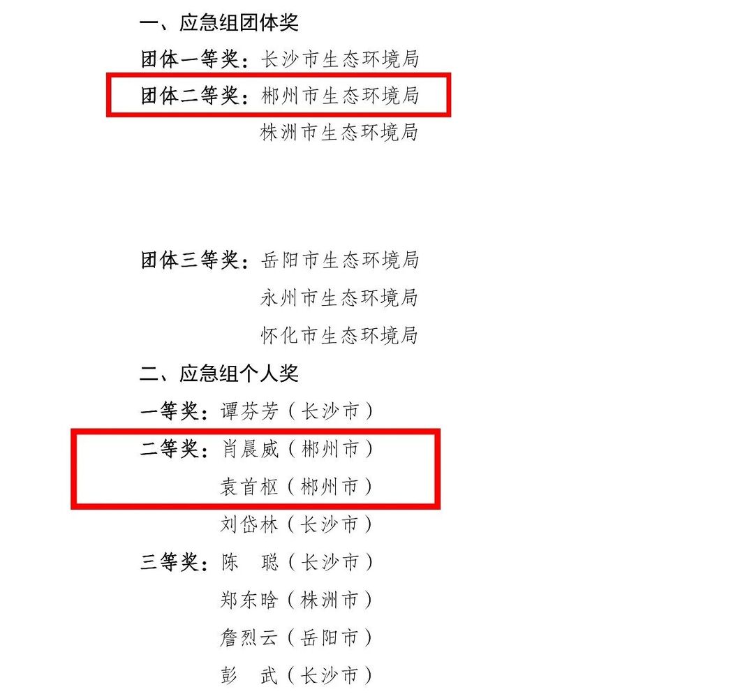2025 年9 月至 11 月, 省生态环境厅将环境应急作为湖南省第十九届生态环境监测专业技术人员大比武的一个赛道组织进行了比武竞赛活动,该赛道参赛队伍分为应急组和支援组分别组织实施,14 个市州生态环境局组织环境应急处置人员参加了应急组的比武竞赛。经综合评定, 现决定对比武竞赛活动中应急组的优秀集体和个人予以通报, 具体名单如下: