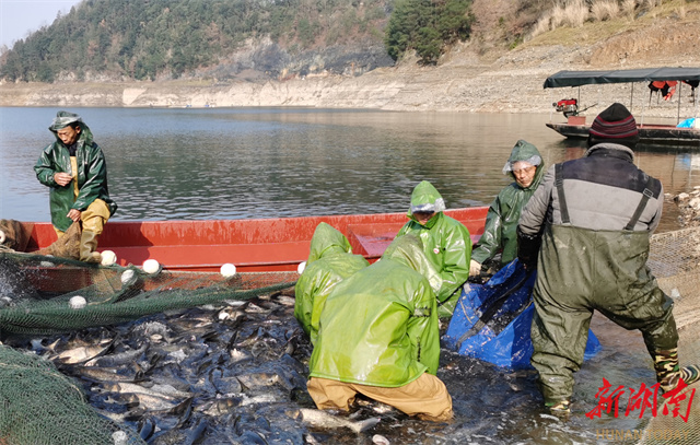 On January 6, the winter fishing season commenced at Yanwutan Reservoir in Yuanling County, with 50,000 kilograms of eco-friendly silver carp harvested for sales. This event attracted numerous non-local fishery dealers to purchase the sustainably farmed fish. The reservoir boasts 18,000 mu (approximately 1,200 hectares) of large-scale aquaculture area, employing methods such as release-based enhancement with natural rearing, stock enhancement, along with regulated fishing, to ensure fishermen directly benefit from the fishery. Simultaneously, the reservoir area continues to explore innovative approaches to integrating fisheries with tourism, with the aim of enhancing its comprehensive industrial benefits. These efforts help achieve a win-win outcome that combines ecological benefits from "using fish to purify water" and "using fish to revitalize water" with industrial benefits from the integration of fisheries and tourism. (Photo/Liu Chunyi and Liu Jingyuan)