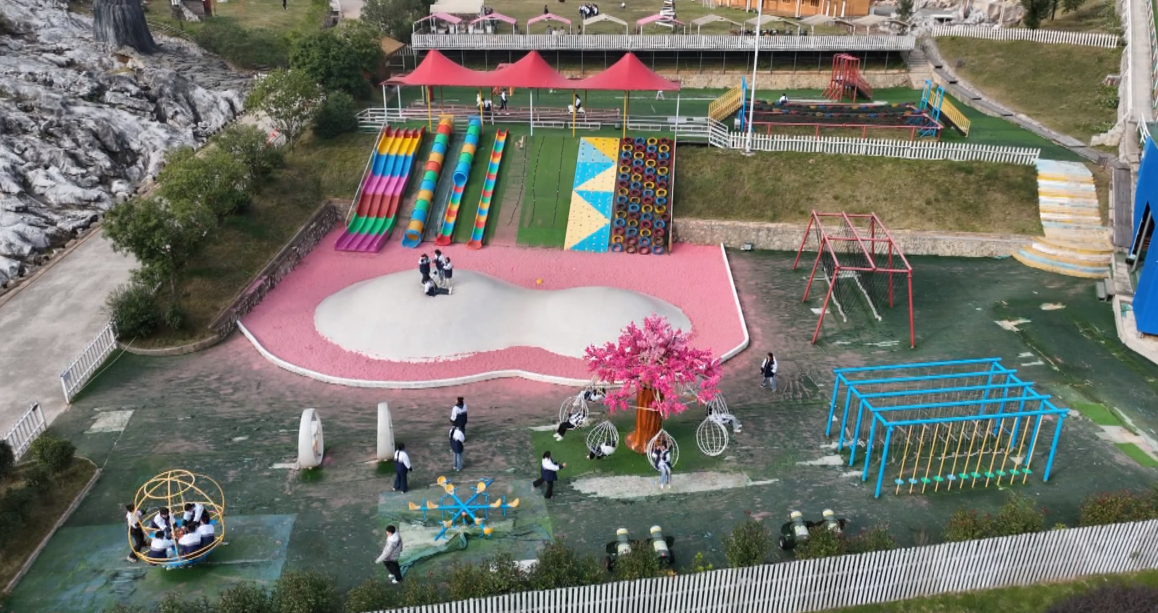 修复后的矿山不仅重披绿装,更被赋予了新的生命和功能。产业园依托紧邻九嶷山景区的优势,根据地形建设亲子乐园、露营基地和餐饮区等,开发成集户外拓展、研学科普和团建游乐于一体的生态旅游区。
