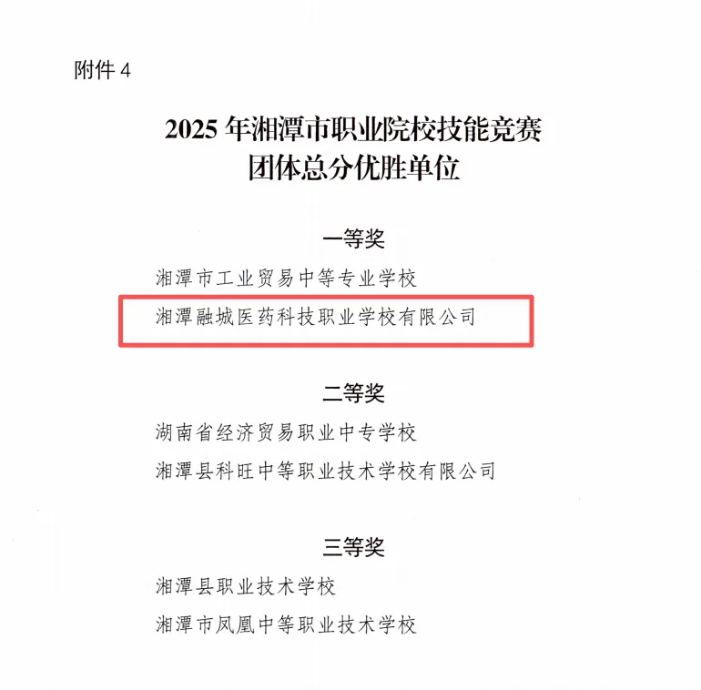 2025年,该校在湘潭市职业院校教学能力竞赛、班主任能力比赛及学生技能竞赛中屡获佳绩,共获得团队与个人奖项数十项,并荣获团体总分一等奖、优秀组织奖等集体荣誉。