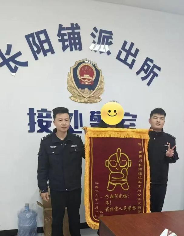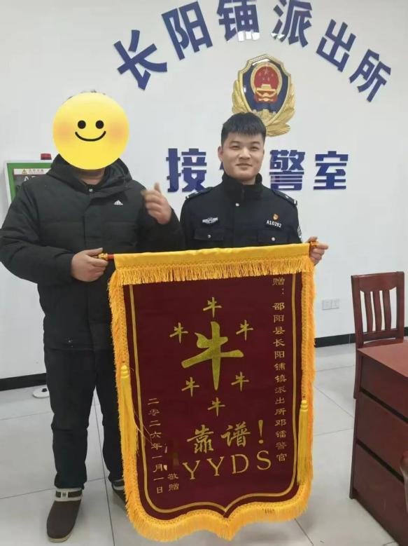 “小邓警官!”2026年1月1日上午,邵阳县公安局长阳铺派出所新警邓镭正在值班时,听到门口传来熟悉的声音。邓镭抬头看见商户王大姐夫妇正笑着快步走来,手里拿着两卷红绸,展开的瞬间:“牛!靠谱!YYDS”“你相信光吗?不!我相信人民警察”金灿灿的大字跃入眼帘,这是长阳铺派出所2026年收到的第一份“双倍认可”,红色缎面在晨光中泛着温暖的光泽,也照亮了新警邓镭微微发红的眼眶。